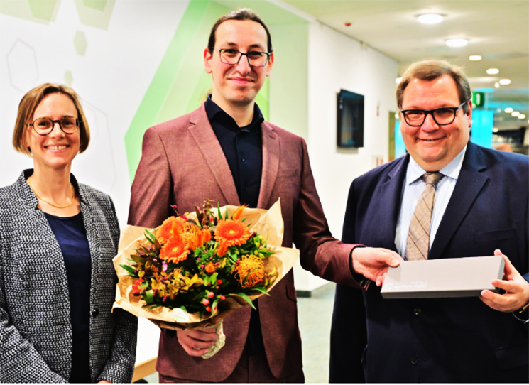 Blumen für Simon Hoffmann – mitten im Bild – zur Ernennung, bei ihm Dr. Katharine Leiska und Frank Meyer, Foto: Krefeld Presse und Kommunikation