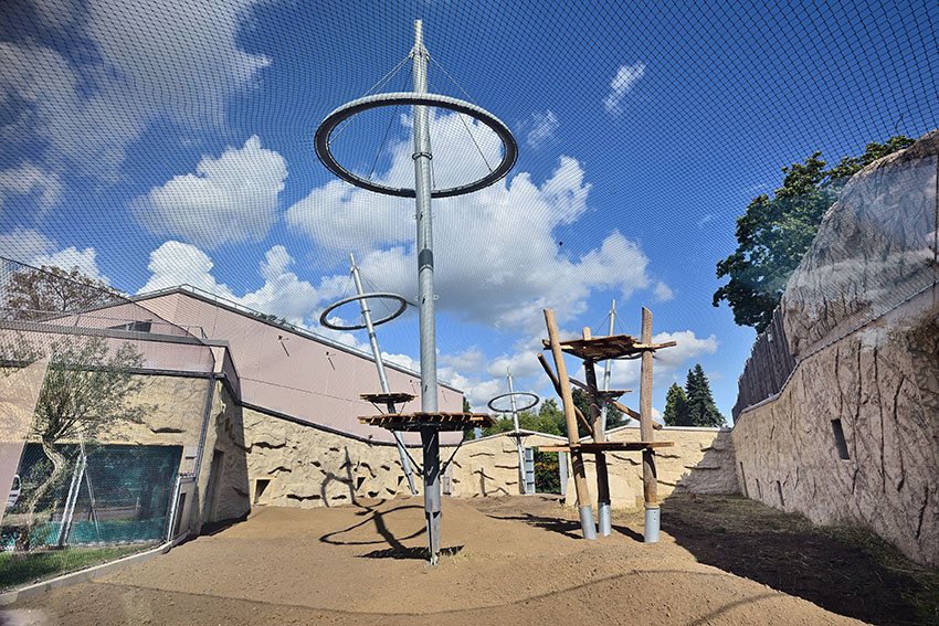 Neben dem rund 800 qm großen Gebäude, das im Obergeschoss die Technikräume beherbergt, finden die Tiere Außenanlagen, die ihrem natürlichen Lebensraum nachempfunden sind. In großer Höhe sind sie mit Edelstahlnetzen überspannt, so dass die Affen nach Herzenslust klettern, hangeln und springen können. „Das Wohlbefinden der Tiere steht für uns an erster Stelle“, betont Dr. Stefanie Markowski. Sie bedankt sich bei allen, die nach der verheerenden Katastrophe am Zoostandort festgehalten haben. Das waren längst nicht alle in Krefeld.