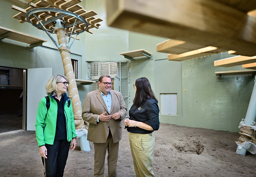Wer schon einmal einen Blick in das Warmhaus werfen konnten, gewahrt eine ausgeklügelte Struktur. In den 7 m hohen Anlagen werden die Affen Seile, Plattformen und Klettermöglichkeiten vorfinden. In kleineren Rückzugsräumen an der Seite sind medizinische Untersuchungen und Trainings mit den Tierpflegern möglich. Auf Knopfdruck können die Milchglasscheiben auf Klarsicht umgestellt werden, so dass Besucher des Zoos die Arbeit mit den Affen aus nächster Nähe verfolgen können. „Die Mensch-Tier-Begegnung wird hier eine große Rolle spielen. Das macht das Artenschutzzentrum so interessant für Forschung und Bildung. Wir bekommen schon jetzt viele Anfragen aus dem In- und Ausland dazu“, weiß die Zoodirektorin.